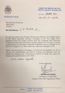 गवर्नर को भेजे खत में पीडीपी चीफ ने लिखा है, ‘जैसा कि आपको पता है पीपल्स डेमोक्रैटिक पार्टी राज्य की विधानसभा में 29 सदस्यों के साथ सबसे बड़ी पार्टी है। आपको मीडिया रिपोर्टों से पता चल गया होगा कि कांग्रेस और नैशनल कॉन्फ्रैंस ने राज्य में सरकार बनाने के लिए हमारी पार्टी को समर्थन देने का फैसला किया है।’
