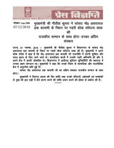 प्रेस विज्ञप्ति, पटना 7 दिसंबर 2018: मुख्यमंत्री श्री नीतीश कुमार ने किशनगंज के सांसद मोहम्मद असरारुल हक कासमी के निधन पर गहरी शोक संवेदना व्यक्त की है मुख्यमंत्री ने अपने शोक संदेश ने कहा है कि मोहम्मद असरारुल हक कासमी जी राजनीति में अपने शुचिता और सरल हृदय के लिए जाने जाते थे सामाजिक कार्यों में उनकी गहरी अभी रुचि थी और वह अपने क्षेत्र में काफी लोकप्रिय थे किशनगंज में अलीगढ़ मुस्लिम यूनिवर्सिटी की स्थापना में उनका अहम योगदान था मुख्यमंत्री ने कहा कि उनके निधन से सामाजिक और राजनीतिक क्षेत्र में अपूरणीय क्षति हुई है
