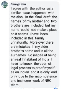 Samir with “Samyy Nan” nickname, on facebook from Assam comments: “In the final draft, the names of my mother and two brothers are included but my name could not make a place. So it seems I have been included in this family unnaturally. Moreover, there are mistakes in my elder brother’s name and in all the surnames. So in spite of being an real inhabitant of India, I have to knock the doors of legal process to prove myself as an Indian and it is only and only due to the incompetence and insincere work of NRC team.”