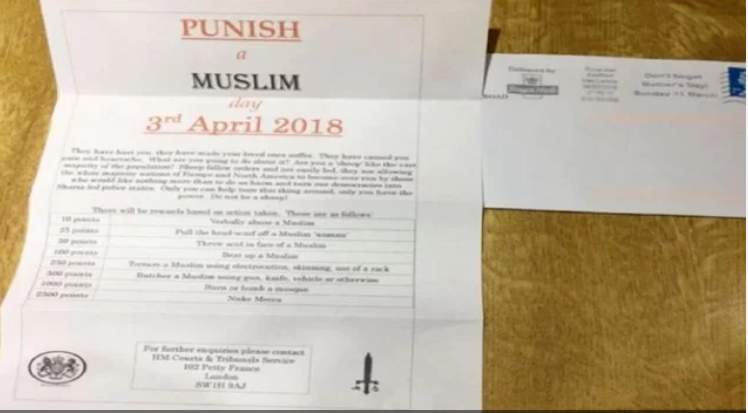 برطانیہ کے انسداد دہشت گردی سے وابستہ افسران ملک کے کئی حصوں سے منظر عام پر آ رہے ان پرچوں کی جانچ میں مصروف ہیں جن میں لوگوں سے 3 اپریل کو ’پنش اے مسلم ڈے‘ یعنی ’مسلمانوں کو سزا دینے کا دن ‘ منانے کی اپیل کی گئی ہے۔ یہ پرچے لوگوں کے پاس ڈاک کے ذریعے بھیجے گئے ہیں۔پرچے میں لکھا ہے۔ ”انہوں نے تمہیں زخمی کیا، انہوں نے تمہارے پیاروں کوتکلیف پہنچائی۔ وہ تمہاری تکلیفوں اور سردرد کی وجہ بنے۔ تم اس کے جواب میں کیا کروگے؟“انگلینڈ میں لندن یارکشائر اور مڈلینڈس علاقہ کے رہائشیوں نے ایسے خطوط ملنے کی اطلاع دی ہے۔ پولس نے ان خطوط کو غلط نیت سے تحریر شدہ قرار دیا ہے۔ ویسٹ یارکشائر کی پولس نے کہا ہے کہ برطانیہ کی نارتھ ایسٹ کاونٹ ٹرریزم یونٹ (این ای سی ٹی یو) اس واقعہ کی جانچ کر رہی ہے۔