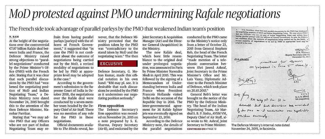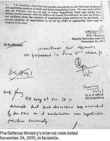 رپورٹ میں 24 نومبر 2015 کو اس وقت کے وزیر دفاع منوہر پاریکر کو اس وقت کے دفاعی امور کے سکریٹری کی طرف سے بھیجے گئے نوٹ کا حوالہ دیا گیا ہے۔ اس رپورٹ کے مطابق سکریٹری نے متوازی سودہ بازی کی مخالفت کرتے ہوئے سوال اٹھایا تھا کہ پی ایم او کو اس میں شامل ہونے کی کیا ضرورت ہے ؟ ۔