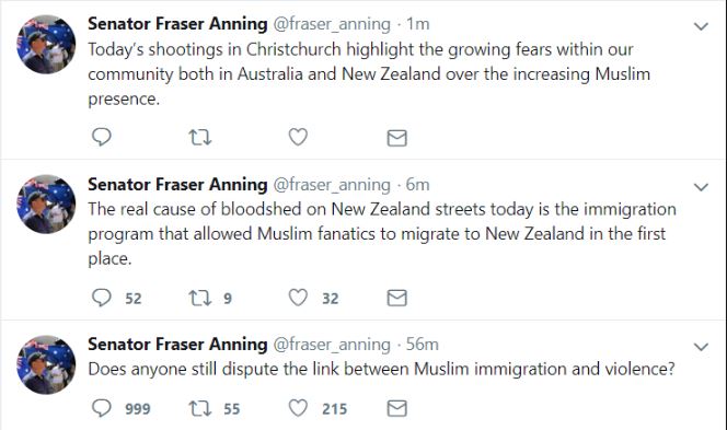 آسٹریلین سینیٹر فراسر ایننگ نیوزی لینڈ میں ہونے والے دہشتگردی کے بھیانک واقعے کا ذمہ دار مسلمانوں کو ٹھہراتے ہوئے کہا ہے کہ یہ حملہ دراصل آسٹریلیا اور نیوزی لینڈ کے عوام میں بڑھتی ہوئی مسلم آبادی کے ڈر کا واضح نتیجہ ہے۔
