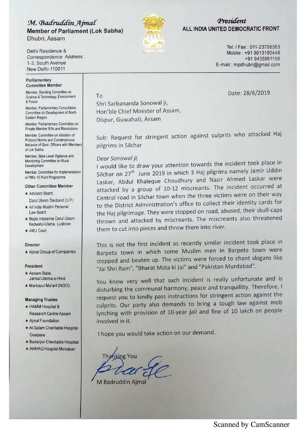مولانا اجمل نے آسام کے وزیر اعلی سربنند سونوال کو خط لکھ کر صورت حال سے آگاہ کردیا ہے اور یہ مطالبہ کیاہے کہ وہ مجرموں کے خلاف سخت کاروائی کریں اور ایسے واقعات کے روک تھام کیلئے سخت قدم اٹھائیں