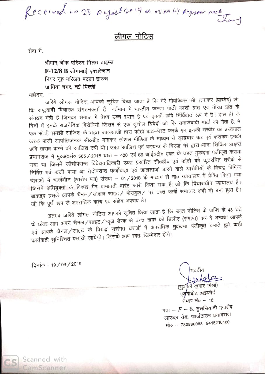دہلی میں واقع ملت ٹائمز کے مرکزی دفتر کو یہ نوٹس 23اگست 2019 کو موصول ہوئی جس میں الہ آباد ہائی کورٹ کے وکیل سشیل کمار مشرا نے لکھا ہے کہ” ہمارے موکل جناب رتناکر پانڈے ایک صاف ستھری شبیہ کے مالک ہیں ۔فی الحال وہ بی جے پی کے کاشی اور گورکھپور کے آرگنائزنگ سکریٹری ہیں ۔ حالیہ دنوں میں ان کے کچھ سیاسی مخالفین جن میں ایک سماجودی لیڈر سشیل ترویدی بھی شامل ہیں نے فوٹو شاپ کے ذریعہ ایک فرضی کیسٹ تیار کی اور سوشل میڈیا کے ذریعہ ان کی شبیہ خراب کرنے کی سازش رچی تھی ۔ اس کے خلاف پریاگ راج (الہ آباد ) کے تھانہ سول لائن میں ہمارے ذریعہ دفعہ 565/2018 دفعہ 420 و 66 آئی ٹی ایکٹ کے تحت مقدمہ درج کیاگیاتھا ۔ تفتیش کے بعد ویڈیو فرضی ثابت ہوئی اورمعلوم ہواکہ اسے فوٹو شاپ کے ذریعہ بنایاگیا تھا ۔چناں چہ فرضی اور جعل سازی کرنے والے مجرموں کے خلاف چارج شیٹ نمبر 01/2018 عدالت میںداخل کی گئی جس کے بعد عدالت نے مجرموں کے خلاف غیر ضمانتی ورانٹ جاری کیا جو کہ ایک نظریاتی انصاف ہے لیکن اس کے باوجود آپ کی ویب سائٹ پر یہ نیوز اب تک برقرار ہے جو ایک مجرمانہ عمل ہے ۔