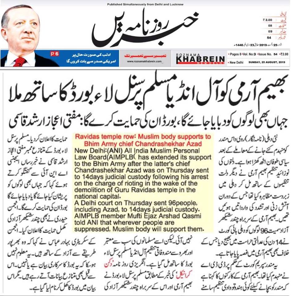 دہلی سے شائع ہونے والے اردو اخبار روزنامہ خبریں نے آج 25 اگست کے شمارے میں ایک رپوٹ شائع کی ہے جس کی سرخی ہے ” بھیم آرمی کو ملا آل انڈیا مسلم پرسنل لاءبورڈ کا ساتھ“ ۔ مذکورہ اخبار نے یہ خبر دکن کرینکل کے حوالے شائع کی ہے ۔ دکن کرینکل نے سرخی لگائی ہے ۔” مسلم گروپ نے بھیم آرمی کی حمایت کی “۔