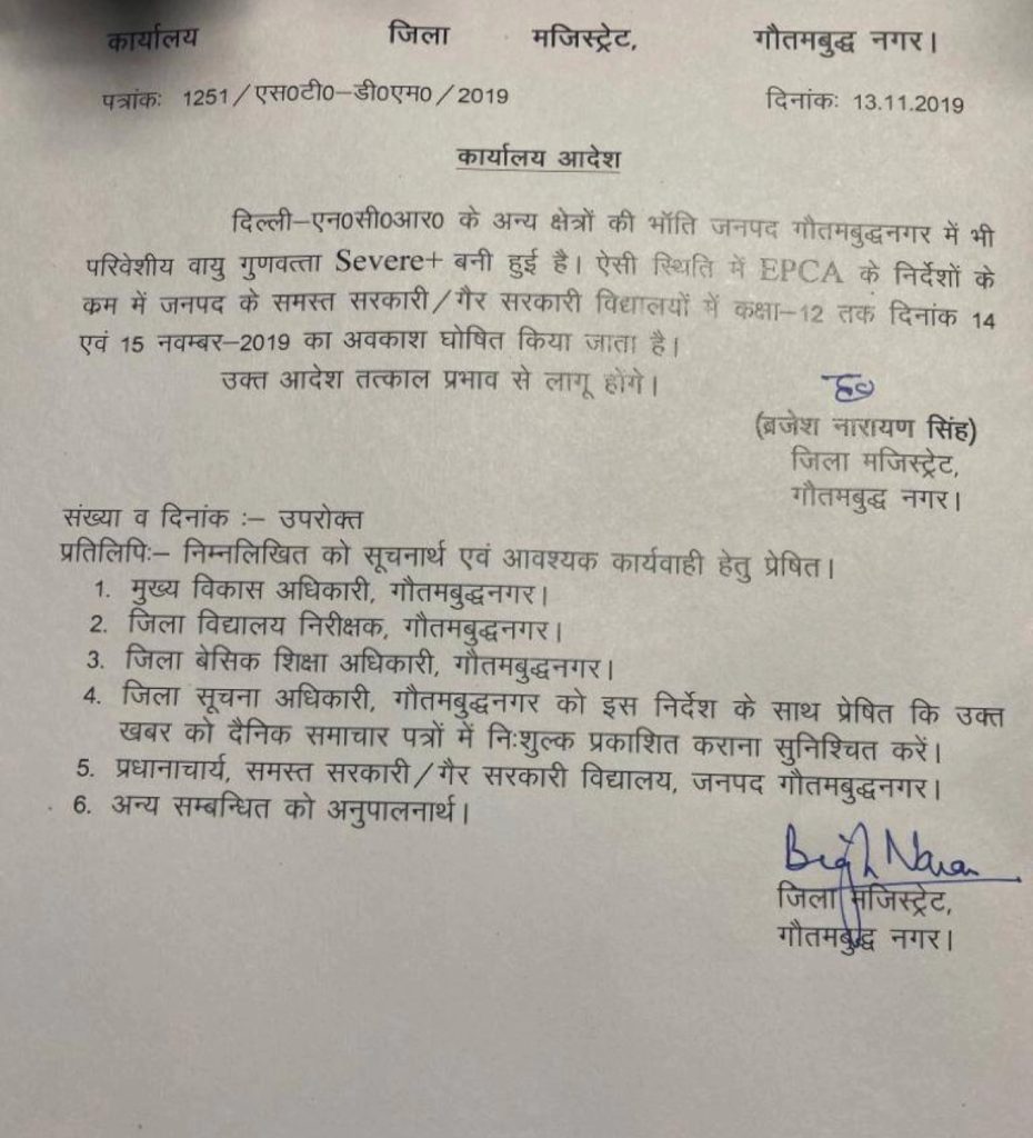 نوئیڈا کے ضلع مجسٹریٹ برجیش نارائن سنگھ نے بھی ضلع کے تمام اسکولوں کو بند رکھنے کا حکم جاری کیا ہے۔ ڈی ایم کے دفتر سے جاری حکم نامہ میں کہا گیا ہے کہ ہوا کی کوالٹی بہت خراب ہے لہذا درجہ 12 تک کے تمام سرکاری اور غیر سرکاری اسکولوں کو 14 اور 15 نومبر کو بند رکھنے کا حکم دیا جاتا ہے۔