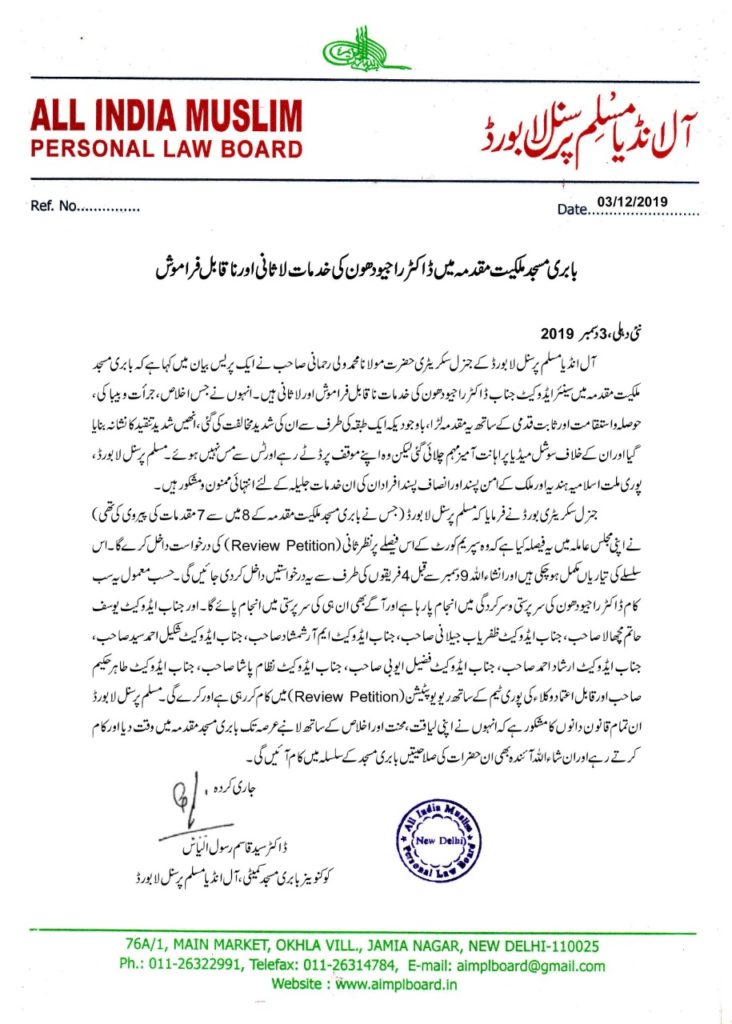 جنرل سکریٹری بورڈ نے فرمایا کہ مسلم پرسنل لا بورڈ (جس نے بابری مسجد ملکیت مقدمہ کے 8 میں سے 7 مقدمات کی پیروی کی تھی) نے اپنی مجلس عاملہ میں یہ فیصلہ کیا ہے کہ وہ سپریم کورٹ کے اس فیصلے پر نظر ثانی (Review Petition) کی درخواست داخل کرے گا۔ اس سلسلے کی تیاریاں مکمل ہوچکی ہیں اور انشاء اللہ 9 دسمبر سے قبل 4 فریقوں کی طرف سے یہ درخواستیں داخل کردی جائیں گی۔ حسب معمول یہ سب کام ڈاکٹر راجیو دھون کی سرپرستی و سرکردگی میں انجام پارہا ہے اور آگے بھی ان ہی کی سرپرستی میں انجام پائے گا۔ اور جناب ایڈوکیٹ یوسف حاتم مچھالا صاحب، جناب ایڈوکیٹ ظفریاب جیلانی صاحب، جناب ایڈوکیٹ ایم آر شمشاد صاحب، جناب ایڈوکیٹ شکیل احمد سید صاحب، جناب ایڈوکیٹ ارشاد احمد صاحب، جناب ایڈوکیٹ فضیل احمد ایوبی صاحب، جناب ایڈوکیٹ نظام پاشا صاحب، جناب ایڈوکیٹ طاہر حکیم صاحب اور قابل اعتماد وکلاء کی پوری ٹیم کے ساتھ ریویوپٹیشن (Review Petition) میں کام کررہی ہے اور کرے گی۔ مسلم پرسنل لا بورڈ ان تمام قانون دانوں کا مشکور ہے کہ انہوں نے اپنی لیاقت، محنت اور اخلاص کے ساتھ لانبے عرصہ تک بابری مسجد مقدمہ میں وقت دیا اور کام کرتے رہے اور ان شاء اللہ آئندہ بھی ان حضرات کی صلاحیتیں بابری مسجد کے سلسلہ میں کام آئیں گی۔