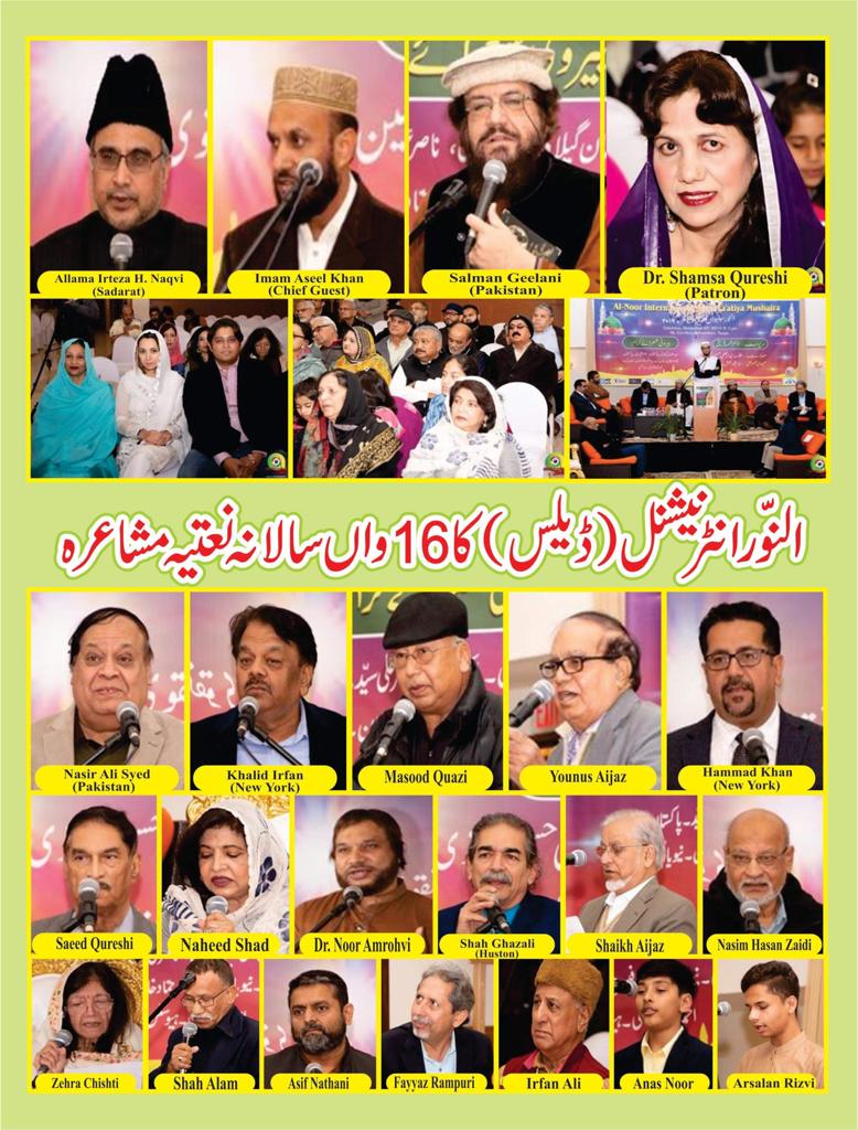 امریکی ریاست ٹیکساس کے شہر ڈیلیس کی مذہبی ثقافتی وادبی تنظیم النور انٹر نیشنل کے زیر اہتمام سولہویں عالمی نعتیہ مشاعرے کا انعقاد کیاگیا ،اس روحانی محفل کا انعقاد امریکہ کی مشہور ومعروف شخصیت ڈاکٹر شمسہ قریشی اور ڈاکٹر نور امروہوی کی جانب سے ہرسال بڑے پیمانے پر انتہائی اہتمام کے ساتھ کیاجاتاہے ۔معروف شاعر ہ وادیبہ ڈاکٹر شمسہ قریشی صاحبہ نے بتایاکہ اس مشاعرہ کا مقصد جشن ولادت رسول اکرم تو مناناہے ہی ساتھ ہی ہماری یہ بھی کوشش ہوتی ہے کہ نئی نسل کو تعلیم محمدی اور اسوہ رسول سے روشناس کرایا جائے ،اسی لئے ہم اپنے پروگرام میں بچوں کو اسٹیج فراہم کرتے ہیںاور بچے نوجوان سبھی بڑھ چڑھ کرذوق در ذوق اس پروگرام میں حصہ لیتے ہیں ۔