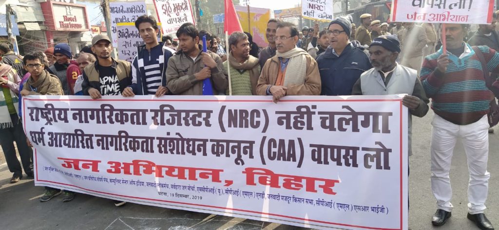پٹنہ: (ملت ٹائمز / فضل المبین ) رام پرساد بسمل اور اشفاق اللہ کے یوم شہادت کےموقع پر یکساں وراثت یکسان شہادت اور یکساں شہریت اور لے کر ہیں آزادی کے نعروں کے ساتھ آج پٹنہ کی ہر چھوٹی بڑی سڑکوں پر عوامی سیلاب سیاہ قانون سی اے اے اور این آر سی کی مخالفت میں امڈ آیا۔ ہزاروں کی تعداد میں ہاتھ میں ترنگا اور مختلف جھنڈے لئے لوگ سی اے اے جیسے ظالمانہ قانون کو واپس لینے کا مطالطہ کرتے ہوئے نعرے بازیاں کررہے تھے۔احتجاج کرنے والوں میں ہر عمر اور ہر طبقے کی نمائندگی دیکھی گئی۔ لیکن بڑی تعداد میں آئین اور جمہوریت کی حفاظت کے نعرے کے ساتھ نو جوان سڑکوں پر اتر آئے۔ گرفتاریوں اور پولس کے ذریعہ لگائے گئے دفع 44کی پرواہ کئے بغیر عوام کا پر امن احتجاج آج صبح 8بجے سے ہی شروع ہوچکا تھا،سڑکیں سن سان اور ریل آمد و رفت پوری طرح متاثر رہی۔