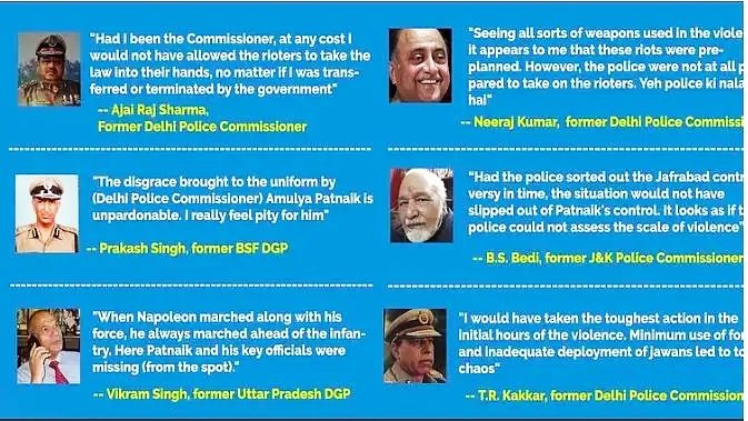 فساد روکنے میں دہلی پولس کی ناکامی پر بی ایس ایف (سرحدی سیکورٹی فورس) کے سابق پولس ڈائریکٹر جنرل (ڈی جی پی) پرکاش سنگھ نے بھی اپنا رد عمل دیا ہے۔ انھوں نے کہا کہ ’’دہلی پولس کمشنر امولیہ پٹنایک کے ذریعہ وردی پر لگایا گیا داغ قابل معافی نہیں ہے۔ مجھے واقعی میں ان پر ترس آتا ہے۔‘‘ اتر پردیش کے سابق ڈی جی پی وکرم سنگھ نے فسادات کے مقامات پر پولس کے مبینہ طور پر جلد نہ پہنچنے کو لے کر تنقید کا نشانہ بنایا۔ انھوں نے کہا کہ ’’دہلی پولس نے اندر دھنش کی طرح کام کیا اور بارش (فساد) تھمنے کے بعد نظر آئی۔‘‘ زبردست تنقید کا سامنا کر رہے پٹنایک کی قیادت پر وکرم سنگھ نے طنز کرتے ہوئے کہا کہ ’’نپولین جب اپنی فوج کے ساتھ چلتا تھا تو وہ سب سے آگے چلتا تھا۔ یہاں پٹنایک اور ان کے اہم افسران (جائے وقوع سے) غائب تھے۔‘‘