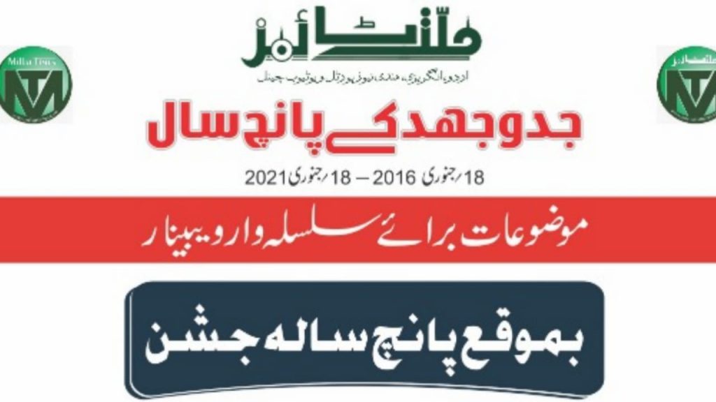 واضح رہے کہ ملت ٹائمز جنوری 2016 میں شروع ہواتھا اور جنوری 2021 میں پانچ سال پورے ہوگئے ہیں ۔ اس مناسبت سے ملت ٹائمز گروپ ان دنوں اپنا پانچ سالہ جشن منارہاہے۔ ویبینار سیریز اسی کی ایک اہم کڑی تھی ۔ اس کڑی میں سوینئر ، پچاس موئثر خبروں کے مجموعہ ، تعارف نامہ اور دیگر چیزوں کی اشاعت، ورکشاپ کا انعقاد اور کچھ دوسرے پروگرامز شامل ہیں ۔