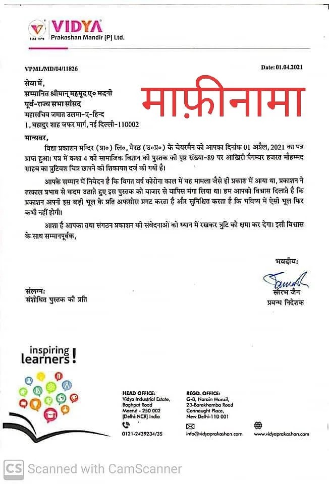 مولانا مدنی کے خط کے جواب میں ودیا پرکاشن مندر لمیٹڈ کے منیجنگ ڈائریکٹر نے مولانا مدنی کو مخاطب خط میں لکھا ہے کہ ”یہ معاملہ پچھلے سال کرونا ماہماری کے وقت منظر عام پر آنے کی بعد ہی اس اشاعت کو فوری طور پر بازار سے واپس منگا لیا گیا تھا۔ ہم آپ کو یقین دلاتے ہیں کہ پرکاشن اپنی اس بڑی غلطی پر افسوس کا اظہار کرتا ہے اور یہ یقین دہانی کراتا ہے کہ آئندہ کبھی ایسی بھول نہیں کرے گی۔