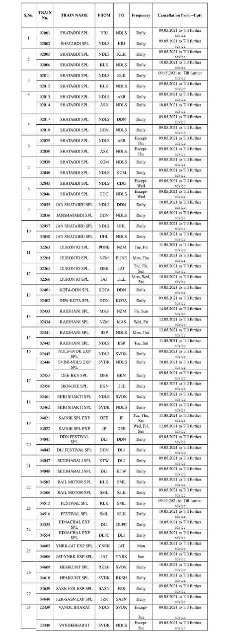 میڈیا ذرائع سے موصول ہو رہی خبروں کے مطابق انڈین ریلوے نے دہلی سے چلنے والی راجدھانی، شتابدی اور دورنتو ایکسپریس سمیت دیگر 28 ٹرینوں کو 9 مئی سے بند کرنے کا فیصلہ کیا ہے۔ اب یہ ٹرینیں کب چلیں گے، اس سلسلے میں آنے والے وقت میں اعلان کیا جائے گا۔ گویا کہ 9 مئی اور اس کے آگے کی جو ٹکٹیں لوگوں نے ان ٹرینوں میں کٹائی ہوں گی، وہ کینسل ہو جائیں گی۔ ٹرینوں کو کینسل کیے جانے سے مسافروں کو پریشانی کا بھی سامنا کرنا پڑے گا۔ جو 28 ٹرینیں 9 مئی سے کینسل کی گئی ہیں، اس کی مکمل فہرست اس طرح ہے: