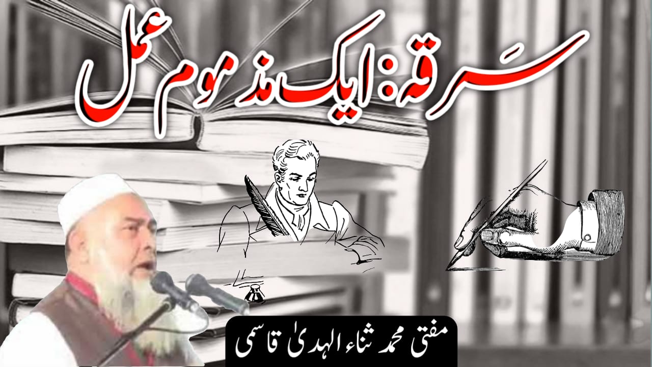 سَرقہ عربی زبان کا لفظ ہے اس کا اردو ترجمہ ’’چوری‘‘ معروف او رمتداول ہے،جس کا مطلب خفیہ طریقے سے کسی اور کی چیز اٹھا لینے کے ہیں،زمانہ قدیم میں چوری کی اصطلاح رات کی تاریکی میں گھر میں گھس کر مال واسباب غائب کرنے کے لیے بولا جاتا تھا، پھر چوری کا یہ عمل متعدی ہوا اور آنکھ جھپکی اور مال غائب کا رواج عام ہو گیا، اب نہ رات کی تاریکی کی ضرورت ہے اور نہ چپکے سے گھروں میں سیندھ لگانے کی اب تو آنکھ بند ڈبہ غائب کا محاورہ عام ہے اس کے مناظر مختلف اسفار میں سامنے آتے رہتے ہیں، آپ چوکنا نہیں ہیں ، سامان کی طرف سے غافل ہیں تو کہاں پر اور کس کے ذریعہ آپ کی جمع پونجی اور مال ومتاع اُچک لیا جائے، کہنا مشکل ہے، چوری کا یہ عمل شاعروں کے یہاں بھی بڑا مقبول رہا ہے، لیکن وہ کسی کا سامان نہیں چُراتے محبوبہ کی آنکھوں سے کاجل اور سرمہ چُرانے میں خاصی دلچسپی دکھاتے ہیں۔