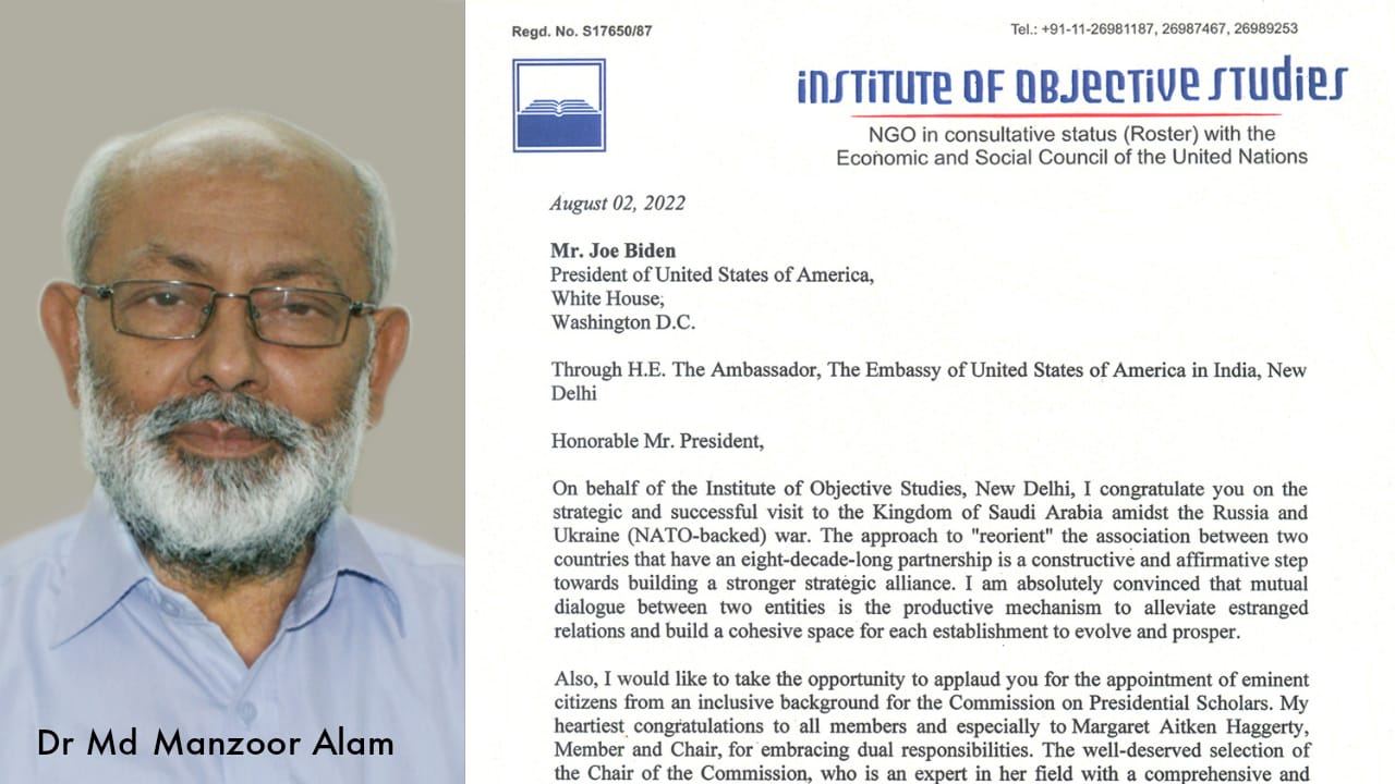نئی دہلی: (پریس ریلیز) معروف دانشور اور انسٹی ٹیوٹ آف آبجکٹیو اسٹڈیز کے چیرمین ڈاکٹر محمد منظور عالم نے امریکی صدر جوبائیڈن کے گذشتہ دنوں ہوئے سعودی عرب کے دورہ کا خیر مقدم کیا اور امریکی صدر کے نام ایک خط تحریر کرکے نیک خواہشات کا اظہار کرتے ہوئے اسلام کی سیاسی اور معاشی نظام میں مذکور انسانیت کی اہمیت ، اکرام انسانیت اور انسانی حقوق کی تفصیل سے وضاحت کی اور بتایا کہ اسلام میں انسانیت اور انسانی حقوق کی کتنی اہمیت ہے جس کو امریکہ سمیت پوری دنیا میں نافذ کرنے کی ضرورت ہے ۔