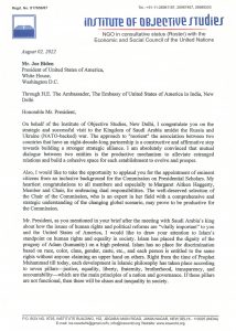 واضح رہے کہ انسٹی ٹیوٹ آف آبجیکٹیو اسٹڈیز کی جانب سے یہ خط گذشتہ 2 اگست 2022 کو ہندوستان میں واقع امریکی سفارت خانہ کو بھیجا گیا ہے ۔گذشتہ 15 جولائی کو امریکی صدر جوبائیڈن نے سعودی عرب کا دورہ کیا ہے ۔