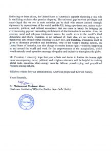 ڈاکٹر منظور عالم نے مزید لکھاکہ مذکورہ ساتوں امور کو امریکہ اپنے سیاسی نظام میں نافذ کرکے دنیا بھر میں انسانیت کے فروغ کا ذریعہ بن سکتاہے اور اس طرح آج دنیا کو جن مشکلات ، پریشانیوں اور افراتفری کا سامناہے اس سے چھٹکارا ملنے میں کامیابی ملے گی ، اس طرح دنیا کے دوسرے ممالک بھی ان چیلنجز پر قابو پاسکتے ہیں کیوں کہ امریکہ سمیت پوری دنیا کیلئے سب سے اہم مسئلہ اور سب سے بڑ ا چینلج انسانی حقوق کا تحفظ ہے اور انسانی حقوق کے تحفظ کی ضمانت اسلام کے نظام میں ہی واضح طور پر دی گئی ہے ۔ اسلام اکرام انسایت کوبغیرکسی تفریق کے اول مرحلہ میں ترجیح دیتا ہے اور مجھے امید ہے کہ امریکی صدر انسانی حقوق کے تحفظ کیلئے ان امور پر توجہ دیں گے اور دنیا بھر میں ہیومن رائٹس کے مسئلے سے نمٹنے کیلئے مذکورہ امور کے سلسلے میں سنجیدگی سے غور وفکر کریں گے ۔