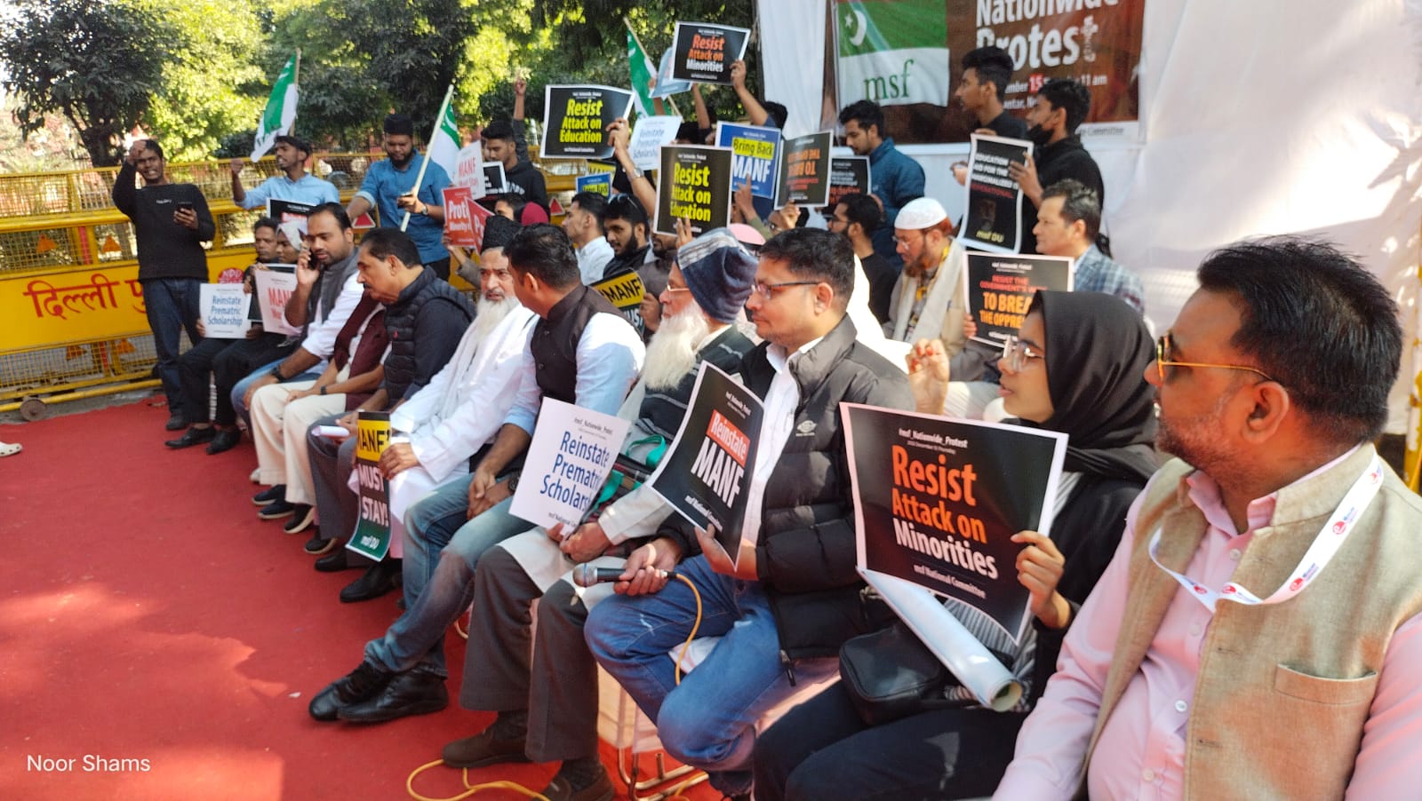 نئی دہلی: (پریس ریلیز) انڈین یونین مسلم لیگ کی ذیلی طلباء تنظیم مسلم اسٹوڈینٹس فیڈریشن آف انڈیا نے آج جنتر منتر میں مولانا آزاد نیشنل پری میٹرک اسکالر شپ بند ہونے کے خلاف زبردست احتجاجی مظاہرہ کیا ہے۔ اس موقع پر ممبر پارلیمنٹ ای ٹی محمد بشیر ، عبدالصمد صمدانی سمیت دہلی پردیش پارٹی صدر مولانا نثار احمد نقشبندی ، آل انڈیا جنرل سکریٹری خرم انیس عمر ، مسلم اسٹوڈینٹس فیڈریشن کے قومی صدر سعادو احمد ،جنرل سکریٹری محمد اتیب خان ، محمد اشرف، ناصر انصاری ، معین الدین انصاری، آصف انصاری، عارف رضا سمیت سینکڑوں طلبہ اور طالبات نے شرکت کی۔