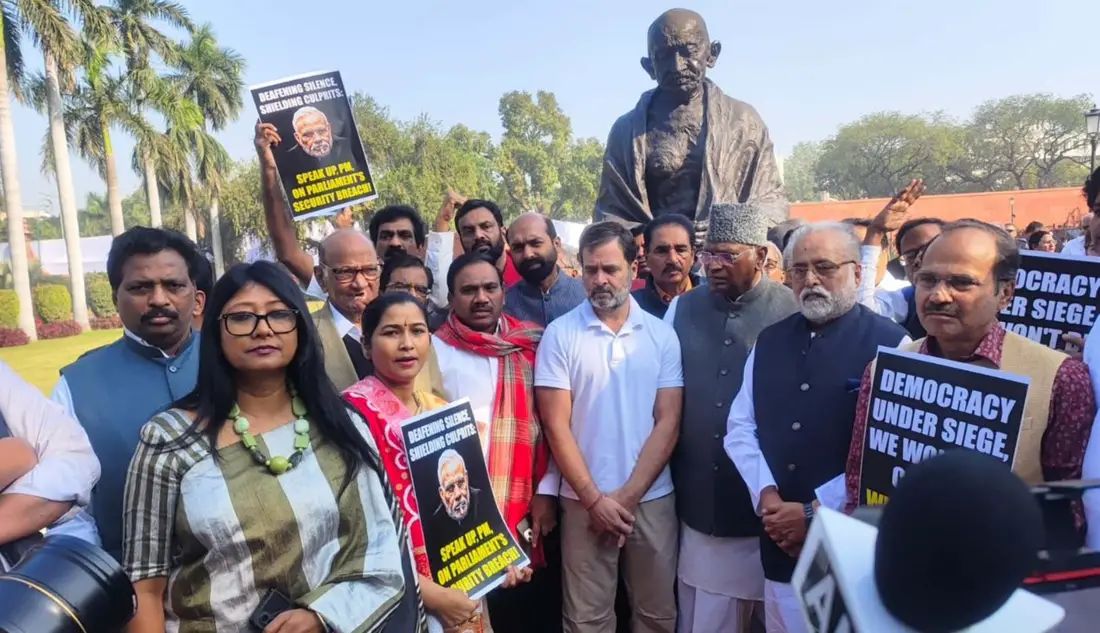 نئی دہلی: 92 ممبران پارلیمنٹ کی معطلی کے بعد اپوزیشن ارکان پارلیمنٹ بشمول این سی پی کے شرد پوار اور کانگریس کے ملکارجن کھڑگے نے پارلیمنٹ احاطے میں گاندھی مجسمہ کے سامنے احتجاج کیا۔