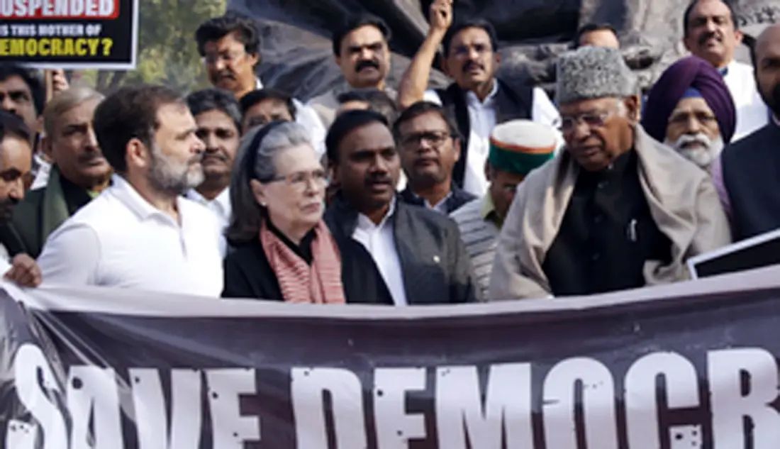کانگریس کے قومی صدر ملکارجن کھڑگے، راہل گاندھی اور دونوں ایوانوں سے معطل ارکان پارلیمنٹ کے ساتھ تمام جماعتوں کے قائدین نے احتجاج میں شرکت کی۔ اپوزیشن لیڈران گاندھی کے مجسمہ پر جمہوریت بچاؤ کے پوسٹروں اور بینرز کے ساتھ جمع ہوئے اور حکومت کے خلاف نعرے بازی کی۔
